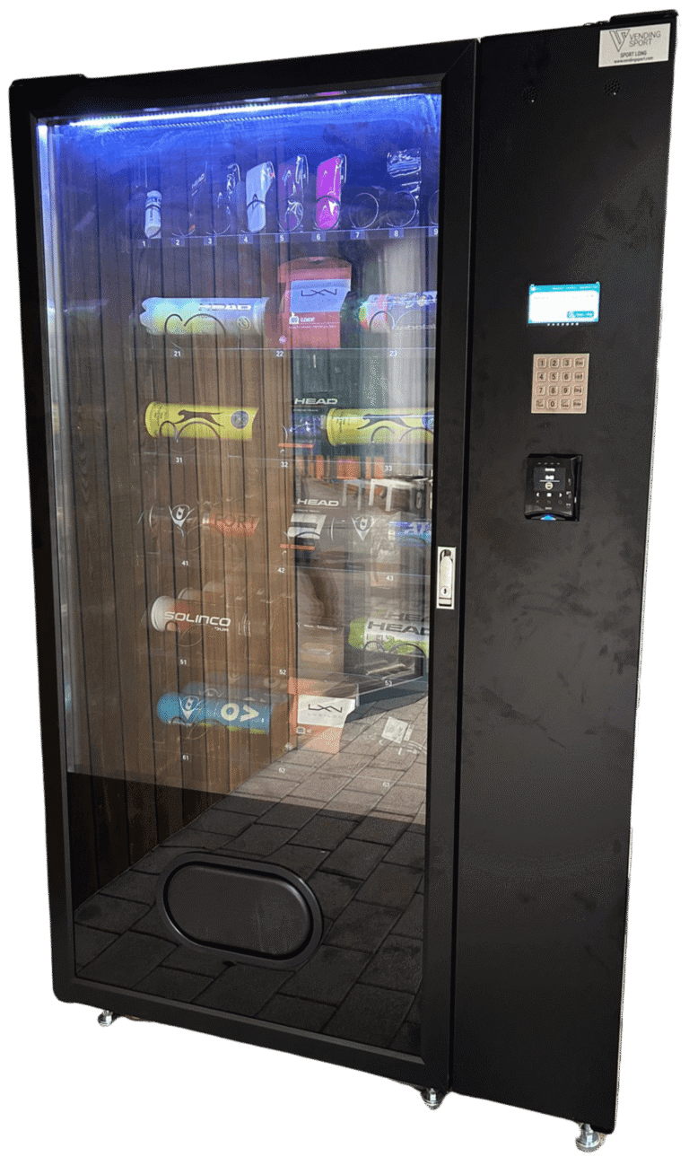 The Vendbox 20 is targeted at tennis, badminton or squash clubs and it has 20 lockers available. It can easily be used for stringing rackets with the customer leaving the racket in the locker for the